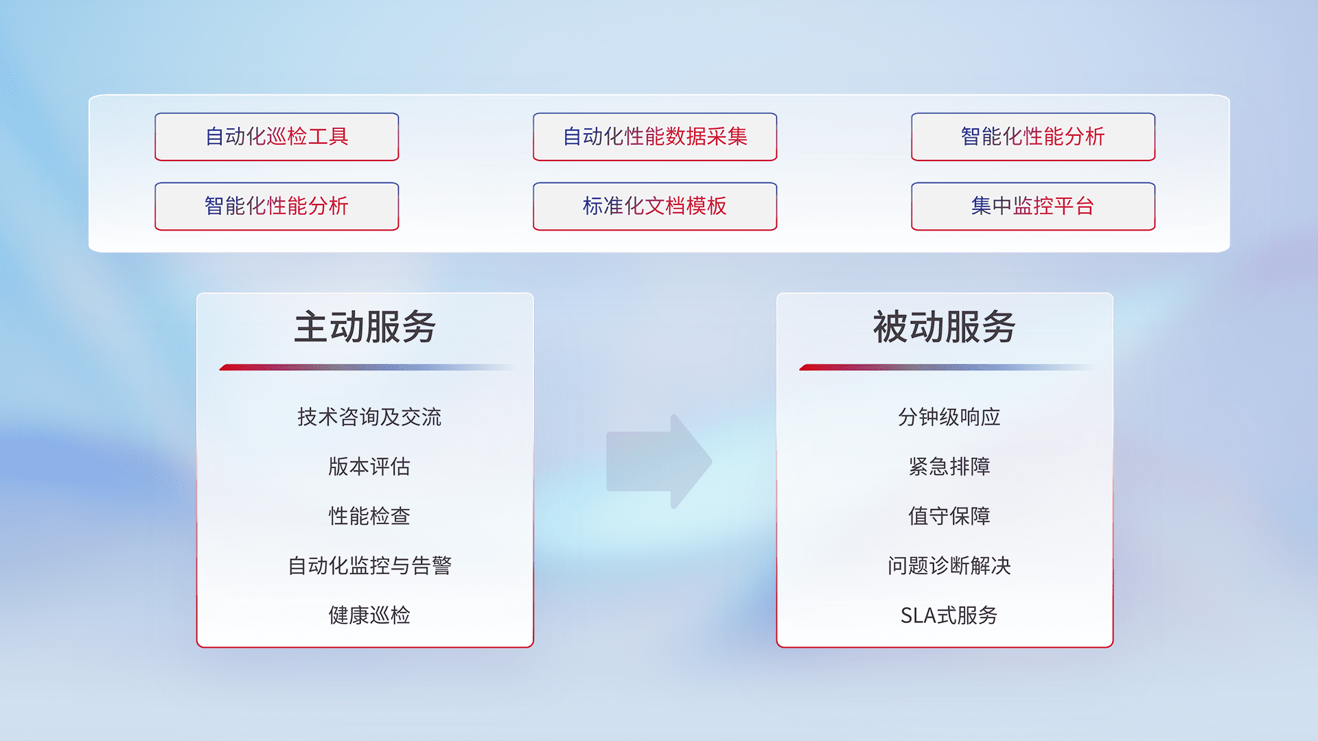 智能化工具和标准化文档,,,保障服务质量,,提供主动服务(包含技术咨询、、、版本评估、、性能检查、、、、自动化监控与告警、、、健康巡检)和被动服务包含(分钟级响应、、、紧急排障、、值守保障、、、问题诊断解决、、、SLA服务)。。。